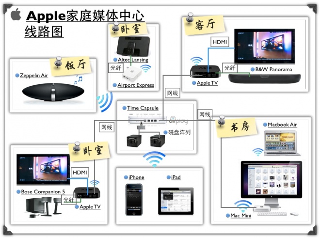 這套方案的核心就是把各類視頻音頻等媒體存儲在NAS裡,然後通過Apple的Airplay技術,將媒體流到各種支持Airplay的設備裡去播放。