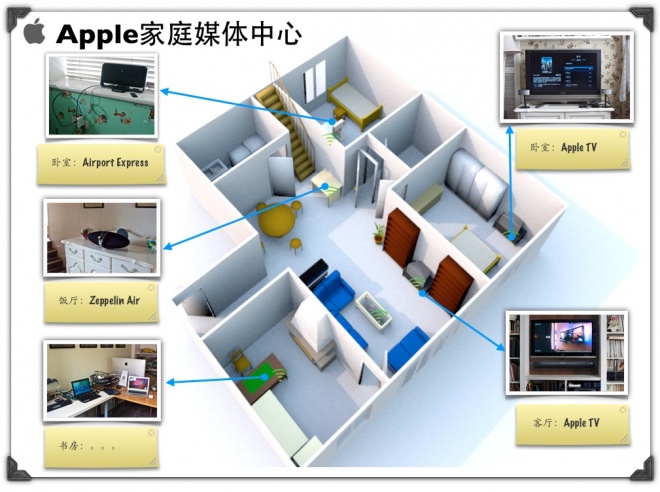 我的這套Apple家庭媒體中心,核心技術就是Apple的Airplay,簡單說,就是通過無線或有線的方式,將iTunes資料庫中的音視頻媒體,流到各個支持Airplay的播放器上進行播放。我就是通過Airplay,將視頻流到各個Apple TV上看視頻,將音頻流到Zeppelin Air。因為我還有一台老的Altec Lansing的音箱,它不支持Airplay,所以我就通過Airport Express的音頻功能,將音頻流過去播放。