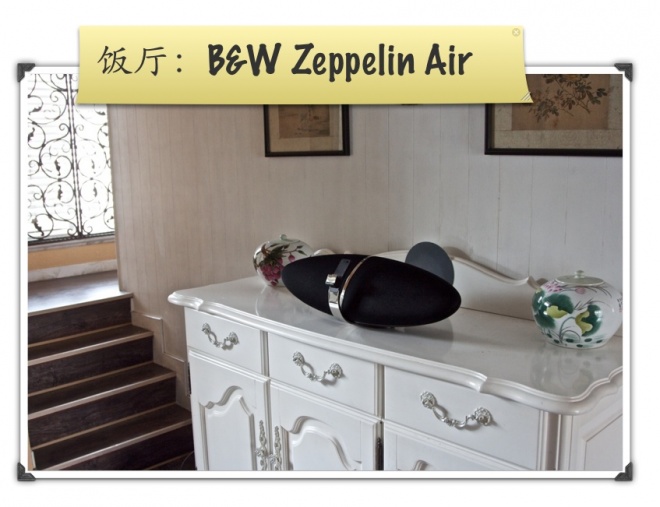 飯廳的邊櫃上是B&W新出的Zeppelin Air,是B&W在老的Zeppelin的基礎上,加上了Airplay功能,並且對音箱也做了升級。這款音響,B&W號稱是世界上最棒的iPod, iPhone音響,聽過以後,才知道B&W絕沒有自誇。音色真是棒!特別是支持了Airplay後,再也不需要把iPod或者iPhone插在它的底座上,你只需要利用iPhone或者iPad上的Remote程序,就可以播放你的iTunes資料庫裡的音樂。吃飯的時候,或者是家裡打掃衛生的時候,聽聽背景音樂,真是享受。強烈強烈推薦!