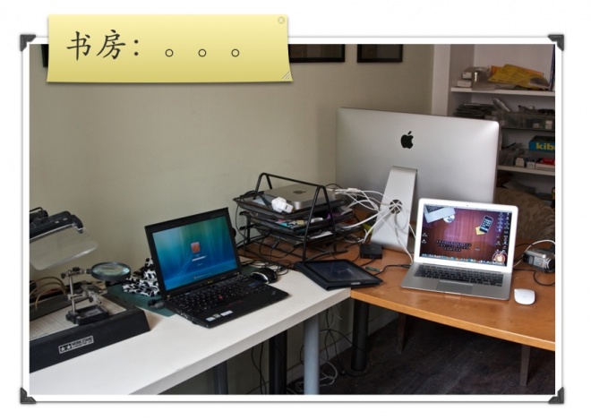 書房裡,Mac Mini加上27’ Cinema Display,是在家裡的PC中心。13’ Air是我平時移動辦公的。IBM是我的windows下載機。