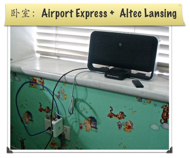 兒童室裡由於和TC隔了幾堵牆,由於無線信號相當的不行。於是就補了一個Airport Express,而且把原來的一個不支持Airplay的Altec Lansing的音響,接了上去。這樣在兒童室裡,也可以享受到Airplay的樂趣。