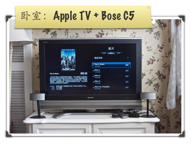 臥室裡也是一台Apple TV,我另外加上了一套Bose Companion 5。這樣在臥室裡,看電影,聽音樂,效果也是非常不錯。通過Airplay,也可以將iTunes資料庫裡的音樂,流到Bose C5上播放。