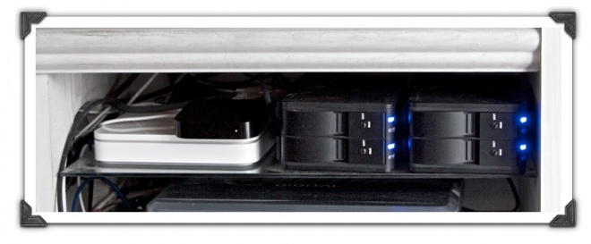 Time Capsule本身內置的硬碟,用來做兩部Mac的Time Machine備份,以及我其它重要數據的備份,比如照片與工作文檔。利用它的USB口,接一個Belkin的一轉四的USB Hub,然後再接上外置的磁碟陣列。目前我接了兩個磁盤盒,每個盒內是兩個2T的的WD HD,5400轉的。這樣8T的存貯,已經可以放接近2000部的720p的高清片子。反正現在Apple TV 2G也不支持1080p的輸出。