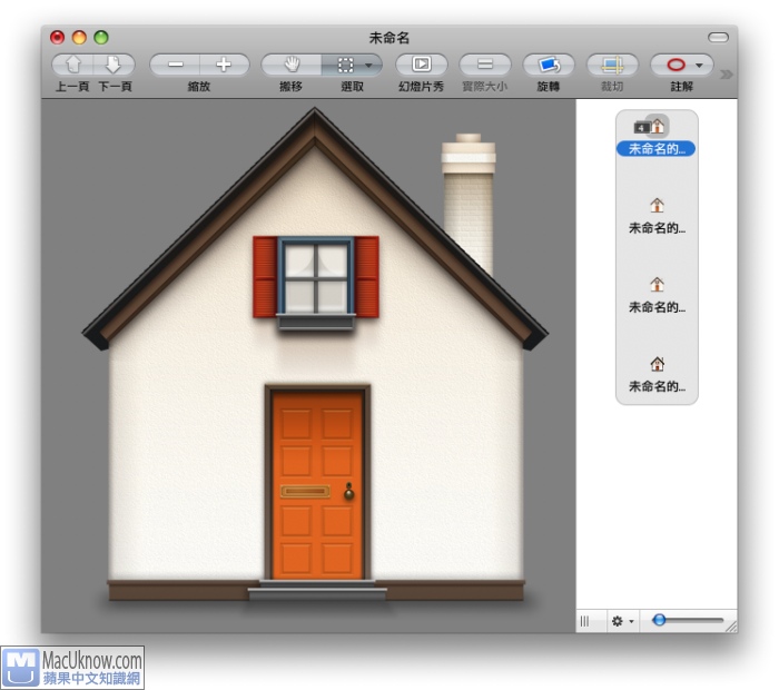 然後開啟”預覽程式”,在預覽程式下直接按下快速鍵⌘+N,就會出現以下的視窗,你會發現,應用程式或檔案等等的icon圖示就被我們取出來了,而且連不同大小的所有icon都排列出來,接著,你可以選擇你要使用大小的icon,按下檔案>>儲存為 就可以把圖示取出來用了~你看看,是不是很酷呢?