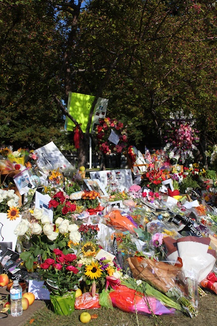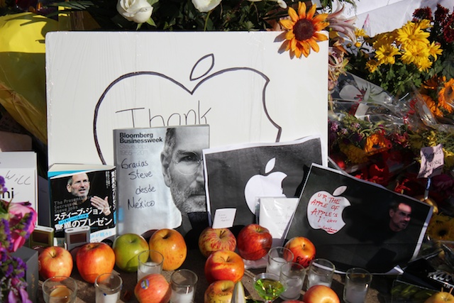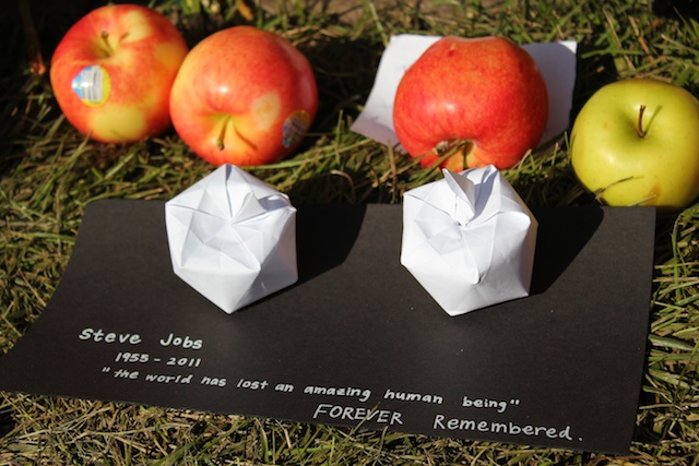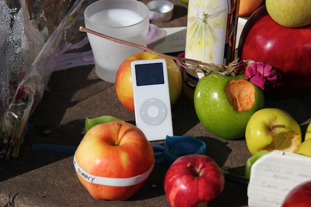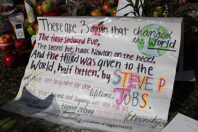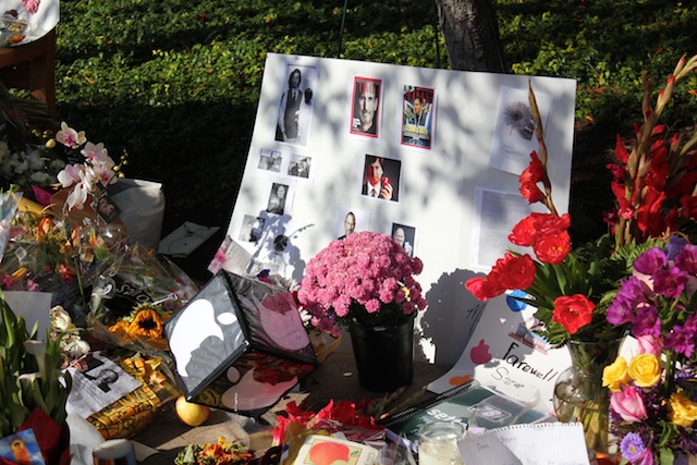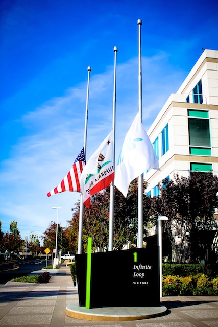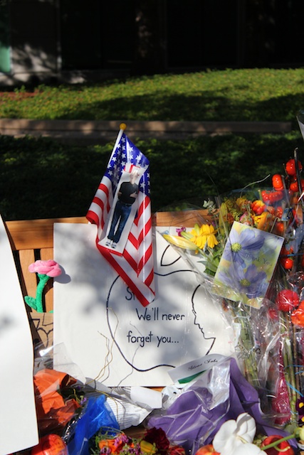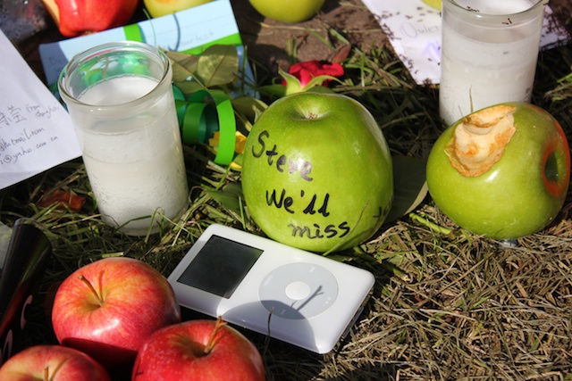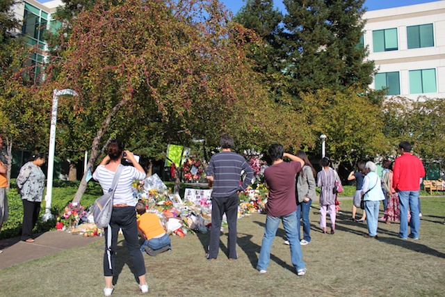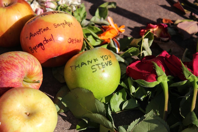 一位可愛窩心的朋友,知道這幾天Stanley一定想去蘋果公司走走,看看大家是怎樣去悼念賈柏斯,於是有了以下的照片,由衷地感謝他。