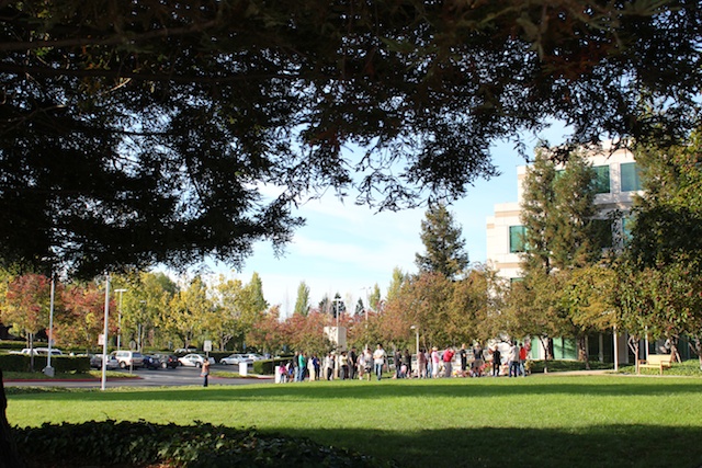 ▼沒有指定的地點或場所,大家就集中在蘋果公司入口的一片小草皮上。