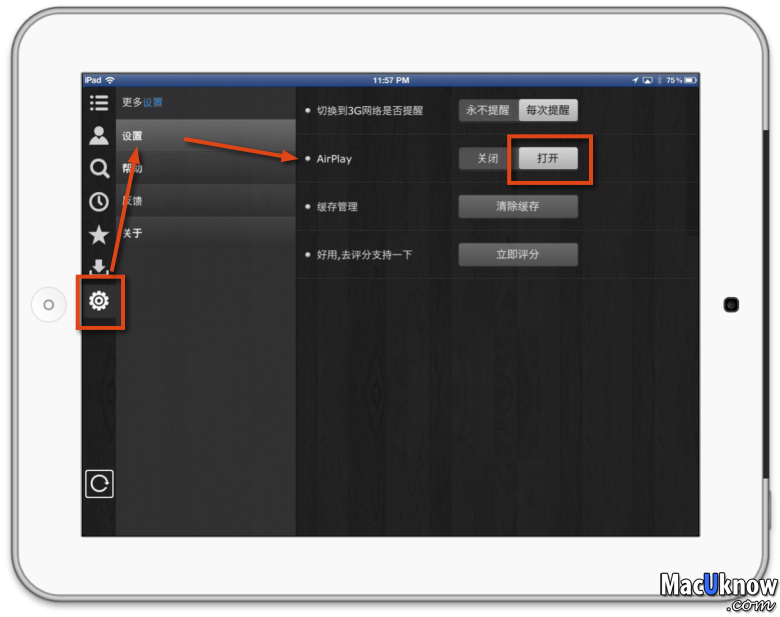 在PPS影音裡面,進入設定裡,在”設置”>>”AirPlay”把它打開。
