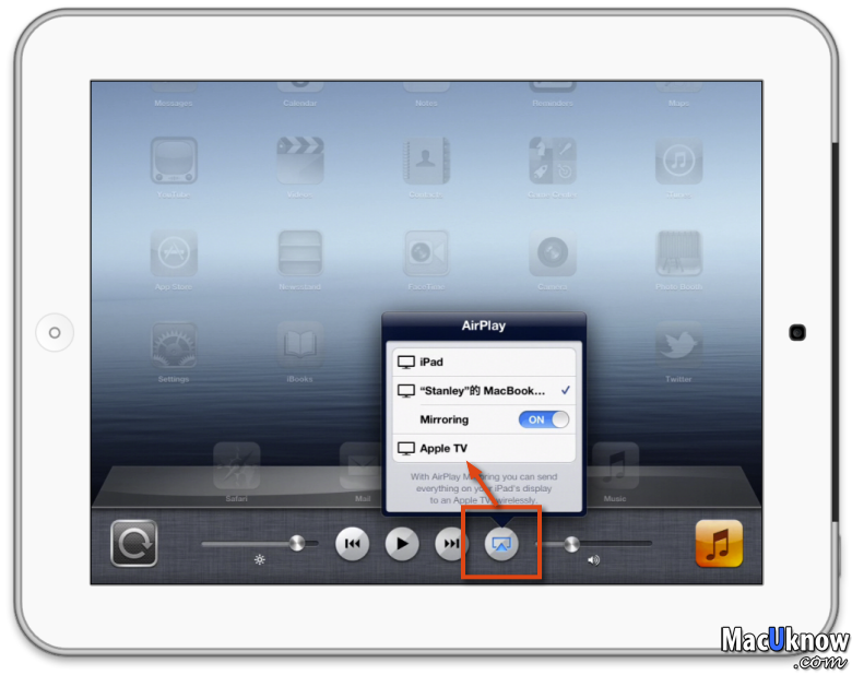 除了以上的應用,還可以將iPad的操作畫面,直接AirPlay Mirroring到電視上,也就是同步顯示iPad的畫面,很適合聚會、使用教學的時候使用~將來10.8 Mountain Lion出來後,Mac電腦也可以這樣做喔,電視同步顯示Mac電腦的畫面,超期待的!!