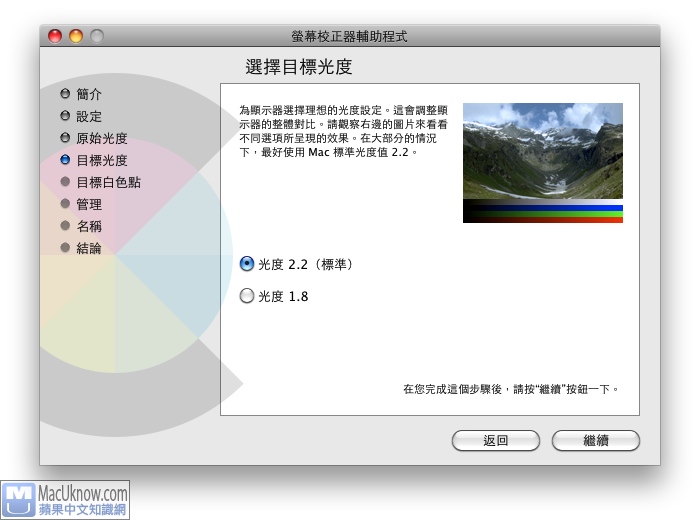 如果想要調回原本的Gamma值,可以進入系統偏好設定>>顯示器>>顏色,點選”色彩校正”,在目標光度的選項中,就可以調整。