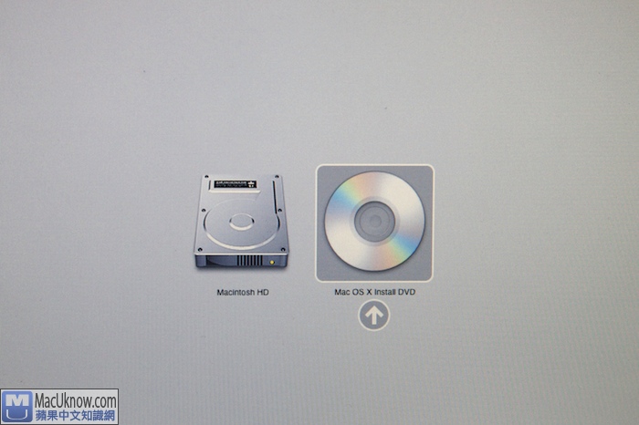 開機之後,放入光碟後,按著鍵盤上的C鍵。或者,你也可以按住Option鍵,就會出現以下的選項,請選擇Mac OS X Install DVD