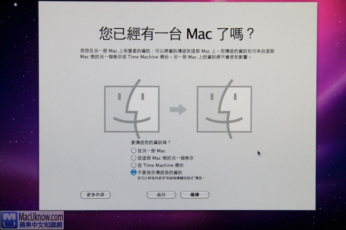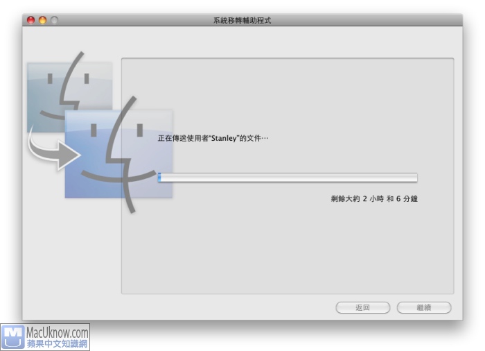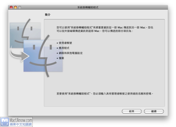 在步驟1中,如果你有參考另外一篇文章,事先使用Carbon Copy Cloner或Time Machine製作備份的話,在乾淨地安裝10.6 Snow Leopard後,可以利用內建的”系統轉移輔助程式”,來幫你把備份出去的所有資料給回復回來。