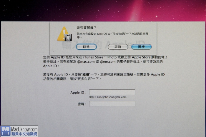 遇到請你輸入Apple ID時,可以先按按Command+Q,點選”略過”。