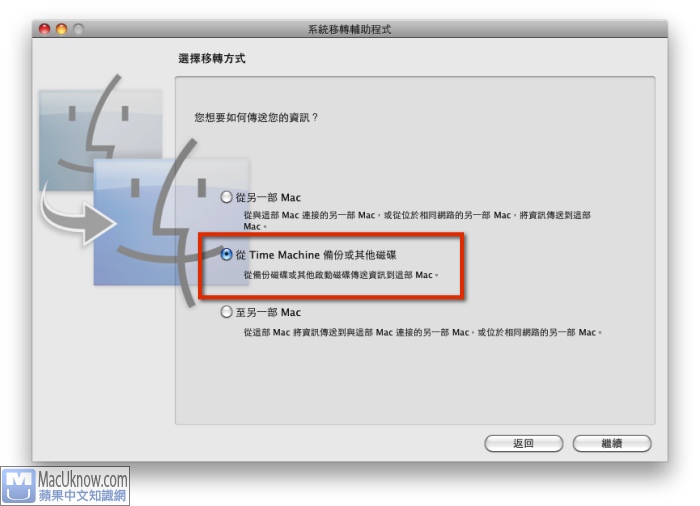 接著,把你的備份資料的硬碟接上電腦,在選擇轉移方式的地方,選擇”從Time Machine 備份或其他磁碟”