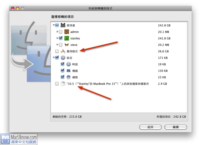 選擇磁碟之後,你應該會看到如下圖所示,可以選擇你想要回復回來的資料,Stanley自己是把”應用程式”和”其他檔案和檔案夾”取消勾選,原因是,Stanley不知道有哪些應用程式是不相容的,想說去下載新版本的來慢慢安裝進系統,這樣會比較穩定,而其他檔案和檔案夾,則是Stanley之前在10.5系統下,安裝了很多奇怪的東西,多了很多資料夾和檔案,如果回復回來,就失去了重新安裝系統的意義了。