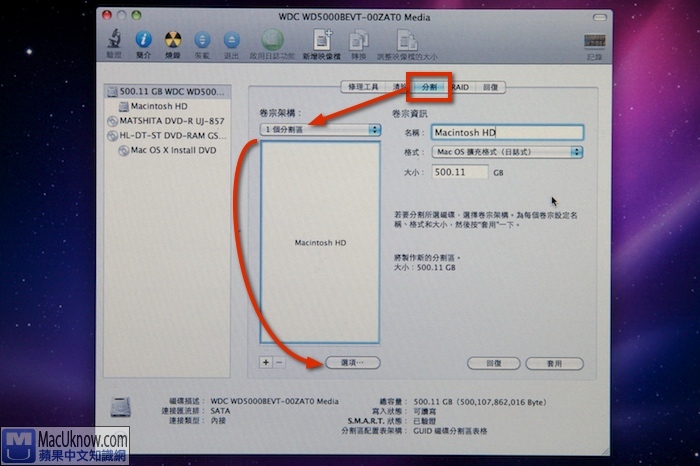 點選你的硬碟之後,點選右邊的”分割”,選擇完你的分割區後,再點選下方的”選項”(如果你將來要用Boot Camp來灌Windows,請先選1個分割區。另外,如果你本來硬碟就有一個Mac磁區,一個Boot Camp磁區,你想要保留原本Boot Camp裡的windows,請選擇Mac磁區,然後點選右邊的”清除”即可,清除完並就可以結束磁碟工具程式。)