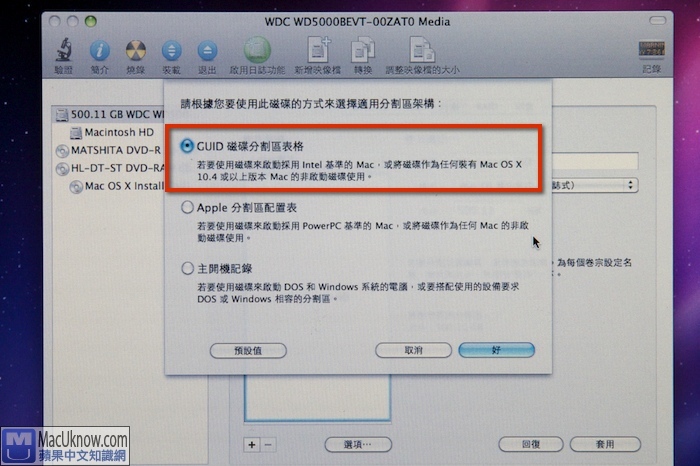 在選項的設定中,請選擇GUID磁碟分割區表格 。點選好之後,再點選套用。