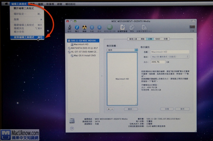 分割完畢之後,點選左上方的磁碟工具程式>>結束磁碟工具程式。