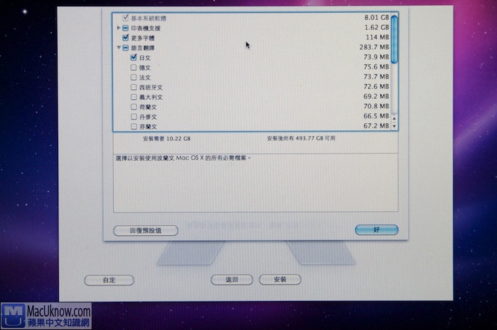 另外,字體的部份,您也可以只留下您要用到的語言字體就好,可以省下幾百MB,很划算。而Rosetta的部份先裝也可以,反正不佔空間3.5MB而已,不裝也沒關係,往後有需要用到Rosetta程式,系統會提醒你要上網下載。