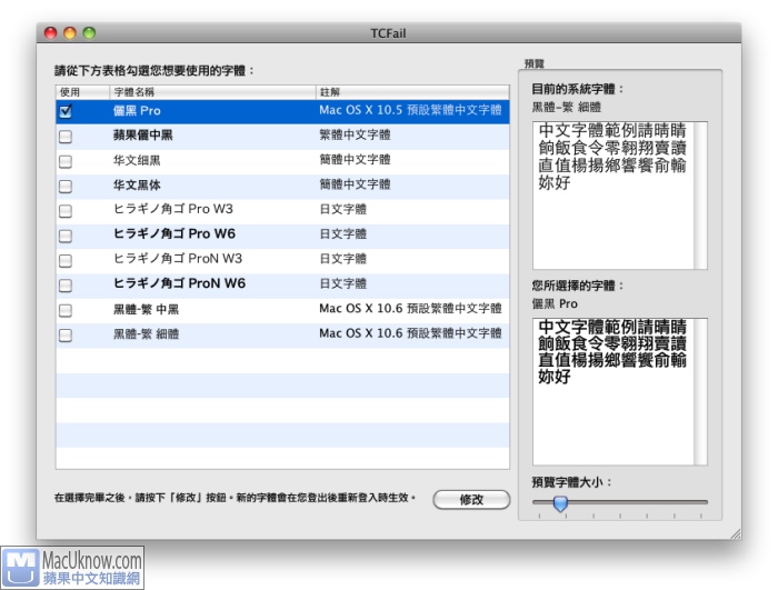 很多朋友發現升級到10.6後,中文的字體變細變醜了,是因為蘋果在10.6中捨棄了原本的儷黑 Pro,而改用黑體。不過,有位熱心的網友出自天殺的憤怒的網友(Weizhong Wang)幫我們做了一個小軟體:TCFail Snow Leopard 繁體中文系統字體修改工具,讓你可以把系統預設的中文字體給換掉。