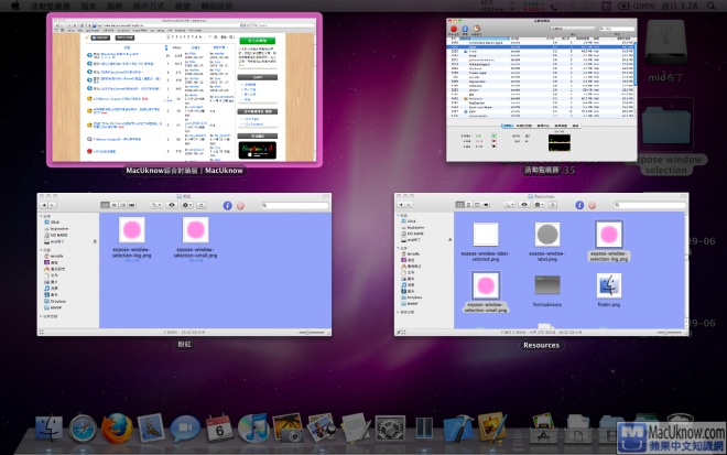 例如可以在將所有視窗散開後,點選 Dock 上的圖示或是按 tab 鍵,就可以顯示出特定程式的視窗,此時 Dock 上的打的聚光燈也很炫麗跟實用喔。