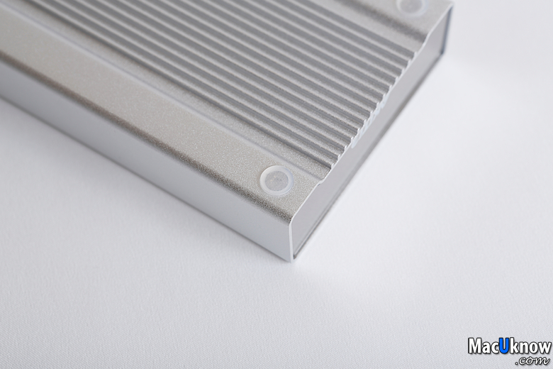 背面的四個角落,用半透明塑膠墊片貼著,讓硬碟放置在桌上的時候,鋁殼不會直接接觸桌面刮傷。