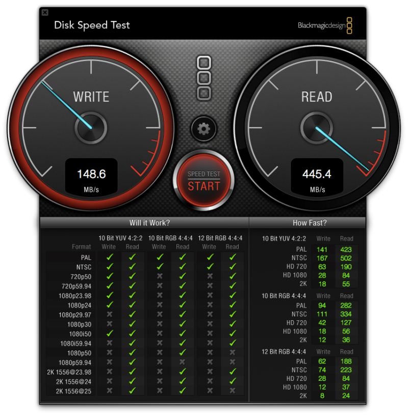 好的,先用Black Magic的Disk Speed Test跑跑看,NEUTINO的讀取速度來到450MB/s左右,非常快!不過寫入速度用這套軟體測試起來,只有大約150MB/s左右…有點奇怪就是了~