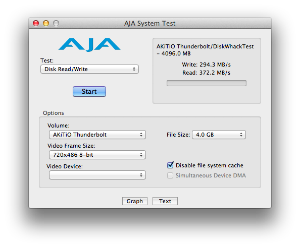 再來,使用AJA System Test來測試一下,寫入速度來到300MB/s左右,讀取速度大約370MB/s,比較平均一點。