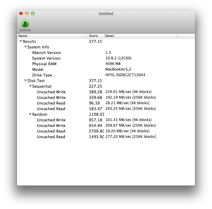 以上三個測速軟體測出來的速度值都不盡相同…大家就當做參考參考~也有可能是測試MacBook Air內建SSD速度箝制了NEUTINO的速度,不然Intel 330系列這顆120GB的SSD,官方理論值,讀寫都有上400MB/s的實力的。
