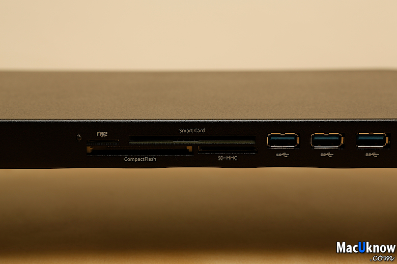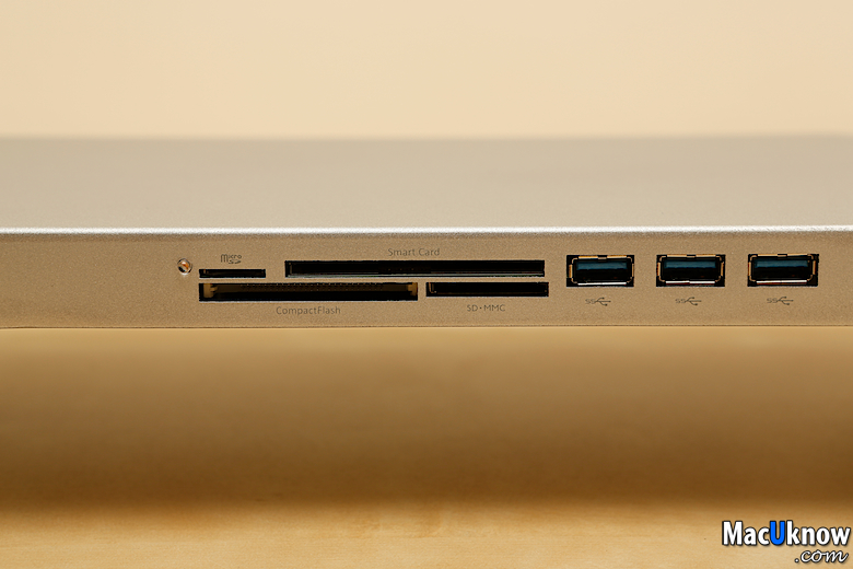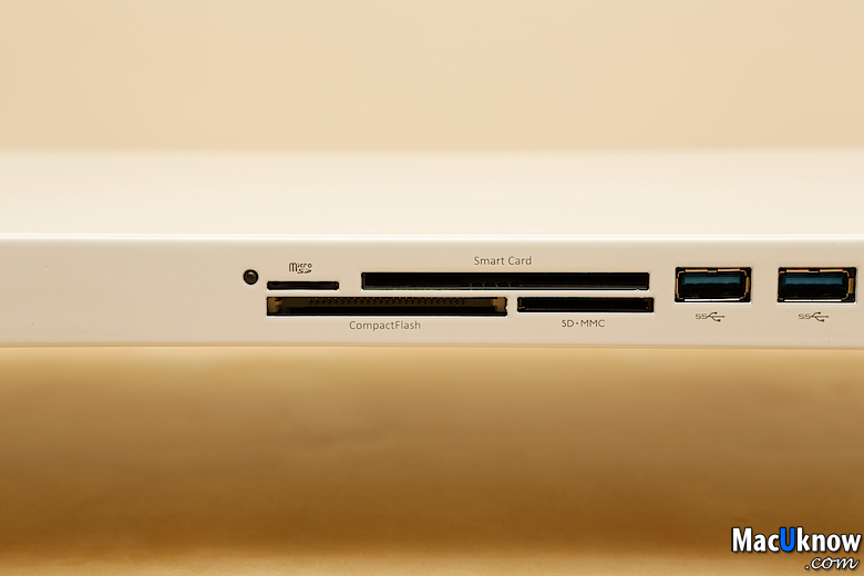從左到右分別為MicroSD讀卡機、CF卡讀卡機、晶片讀卡機、SD/MMC讀卡機(支援到SDHC 64GB)、三個USB 3.0埠。