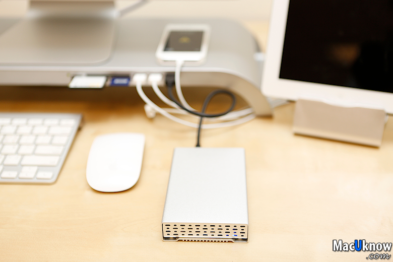 實際接上各種線材的樣子!藍色的USB 3.0線接電腦,電源孔接獨立電源供應器,另外兩個USB 2.0的埠,可以提供一些要接『有線鍵盤、滑鼠』或『無線接收器』的使用者來用,因為這些裝置都不需要用到USB 3.0,2.0就足夠了~(至於為什麼還是有人要接有線鍵盤、滑鼠,有可能是懶得換電池,或是打遊戲要用的吧~)