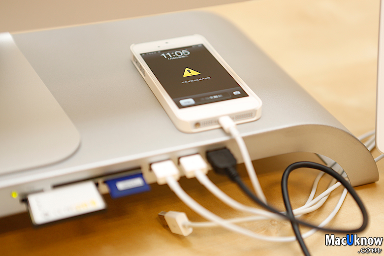不過如果3個USB 3.0埠都有用的話,其他裝置會電流不足,例如iPhone就會顯示無法充電。所以需要用到供電的裝置,請使用兩個USB埠就好。例如,一埠使用2.5吋外接硬碟,一埠iPhone充電還是可以的。