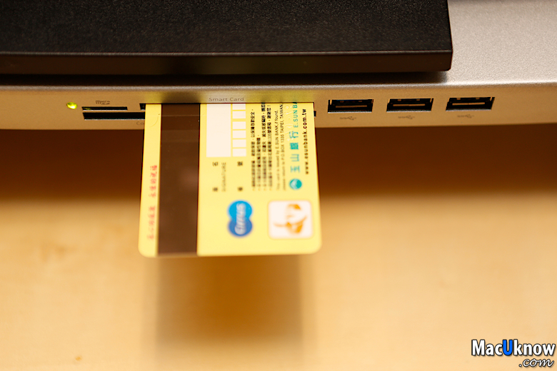 最後,是晶片讀卡機的在Mac裡使用的測試!(Windows裡可直接使用,若找不到驅動程式,可以在這裡下載 http://1drv.ms/1pLYXQX,裡面包含Windows驅動程式,可用手動安裝。)首先,要請大家注意,有晶片卡的那面請向下,晶片朝裡面插入,才能正常使用喔~