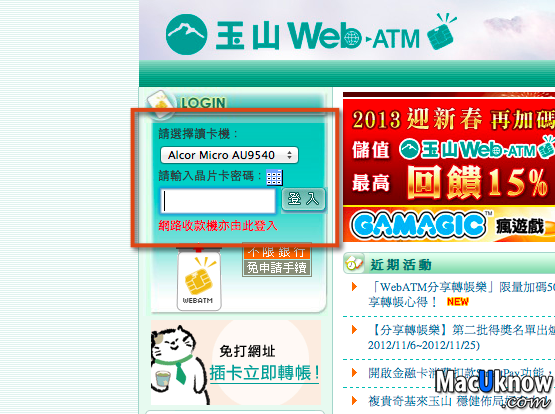 並且Ultra 3.0的Smart Card晶片讀卡機 ,Mac電腦也可以使用喔,只要下載安裝驅動程式,就可以透過玉山銀行WebATM使用Safari來用網路ATM,讚啦!!