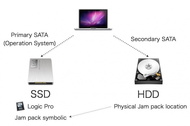 我自己最常使用的軟體是Logic Pro,應用程式的大小大概只有7、800MB,但是Logic Pro 卻有許多Jam Pack音源庫等,音源庫是無限增加的,基本款大概就要耗掉50GB硬碟,而在安裝Audio Packge的時候,系統會要求必須要安裝在與Logic Pro同一個硬碟中,這時就會出現SSD容量不足的問題了
