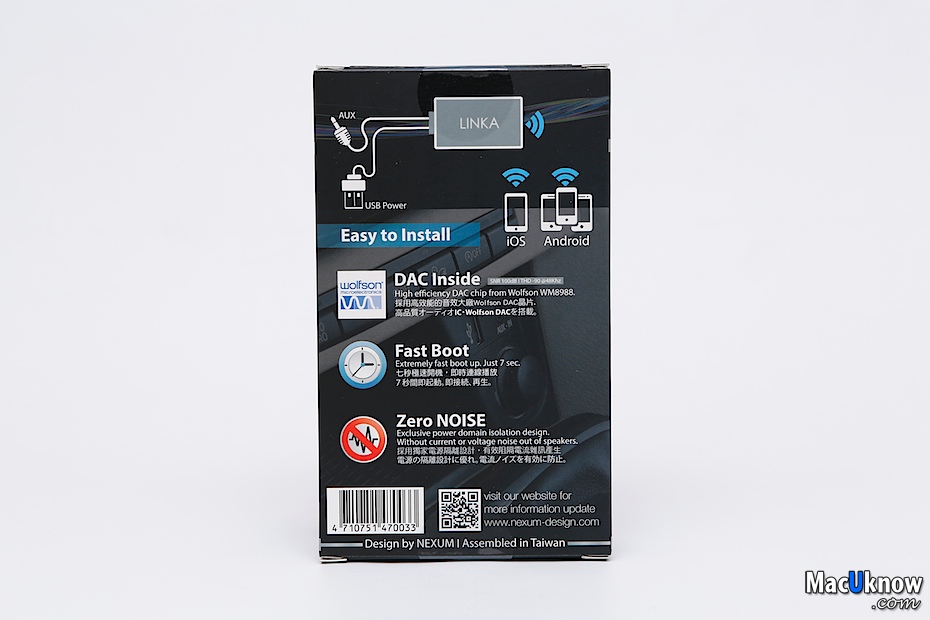 ▼翻到外包裝背面,可以看到這次LINKA的改進項目,包含了採用高效能的音效大廠Wolfson DAC晶片、快速的啟動時間,以及因為要裝車上用,大部分人會使用車充或是車上USB孔來供電,供電品質比較不穩定且電流干擾較多,因此多了電源隔離設計,有效地降低電流雜訊干擾!