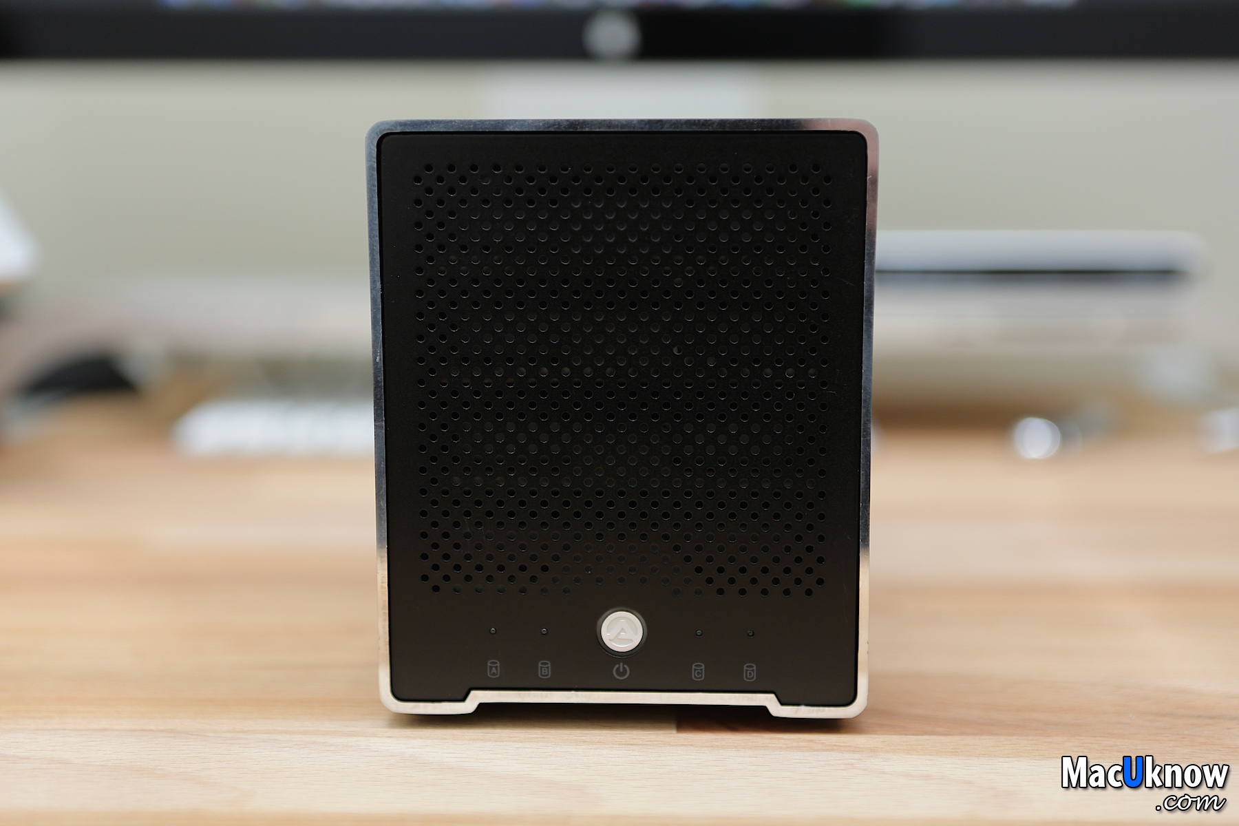 正面下方有個AKiTiO的Logo,是電源開關,並且旁邊兩側,有內部硬碟狀態的LED指示燈。