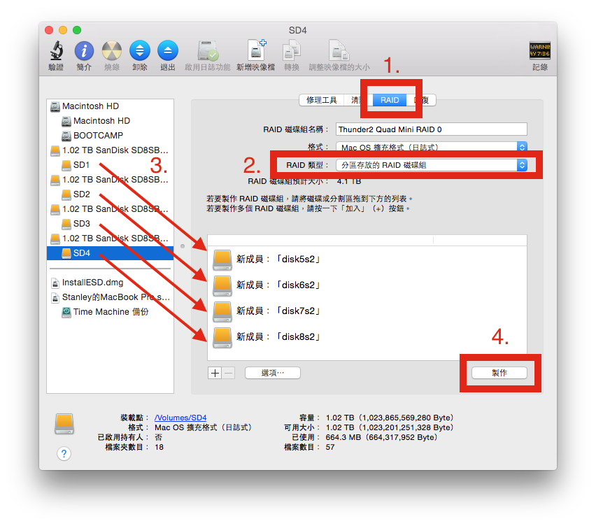 如果你的每個硬碟都還是剛買來而已,連分割區都沒有的話,建議你第一步,是選擇某一顆硬碟之後,進入到『分割』頁面,把它先分顆一個磁區出來,並且格式選用『Mac OS 擴充格式(日誌式)』,然後重複步驟,把每一個硬碟都分割一個磁區出來,例如以下Stanley這邊做好了SD1、SD2、SD3、SD4磁區。