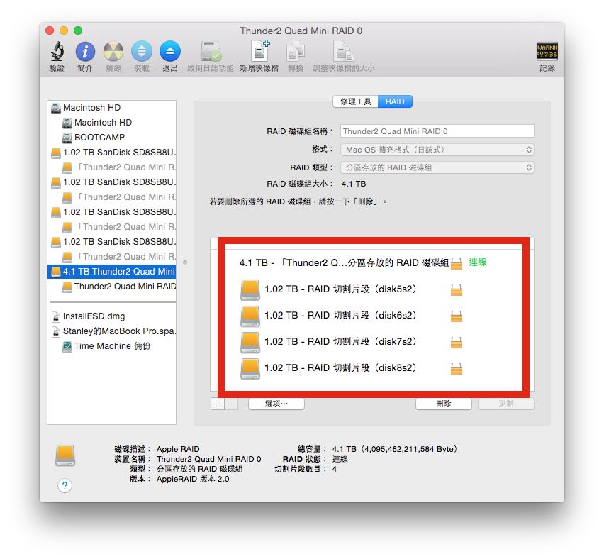 這樣,就表示我們製作好AKiTiO Thunder2 Quad Mini上四顆SSD的RAID 0組態囉!