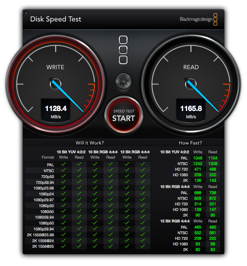 讀取來到1165.8MB/s,寫入來到1128.4MB/s,超級快的啊!果然正式超越了Thunderbolt 1的介面速度,讀寫破1000MB/s,真的需要用到Thunderbolt 2介面,才跑得到這麼高速了!
