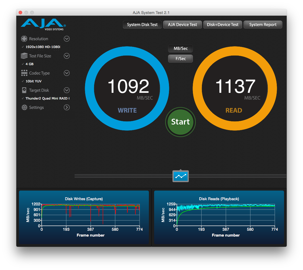 ▼換用另一個AJA System Test軟體來測試看看!讀取1137MB/s,寫入1092MB/s,差不多~