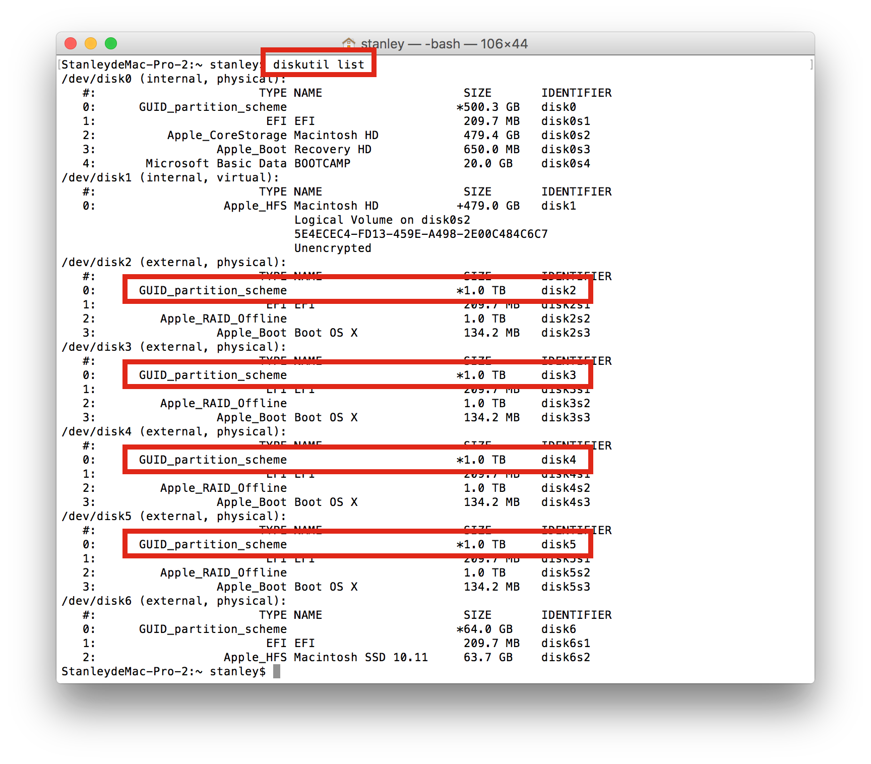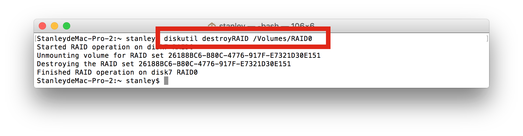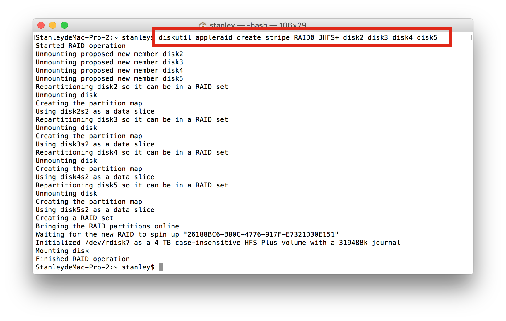 diskutil appleraid create stripe RAID0 JHFS+ disk2 disk3 disk4 disk5
