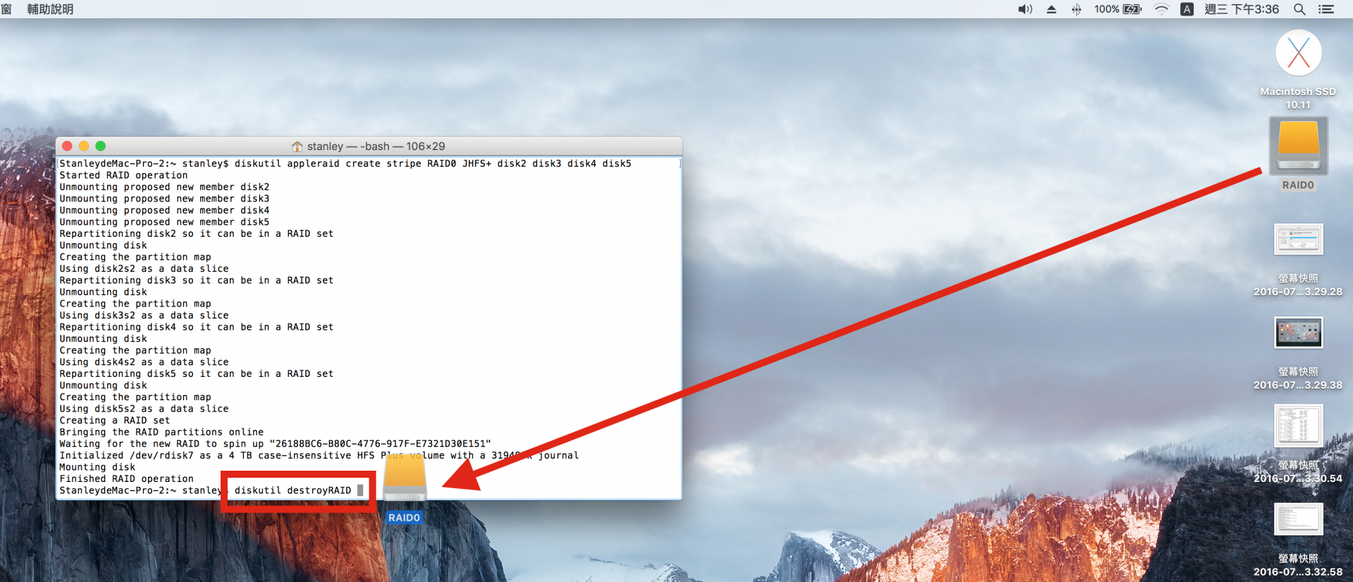 ▼若在10.11裡面,要解除這個RAID組態,也需要透過終端機指令。