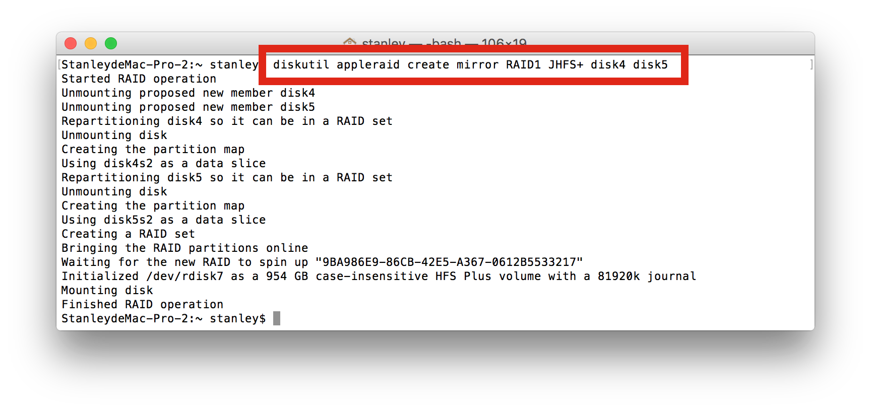 diskutil appleraid create mirror RAID1 JHFS+ disk4 disk5