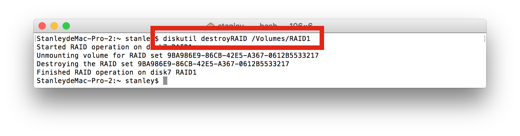 你也可以把RAID1磁碟的桌面圖示,拖拉到diskutil destroyRAID後方,會自動填寫路徑。(注意:其中RAID1是我磁碟的名稱,可能和你的不一樣喔。)
