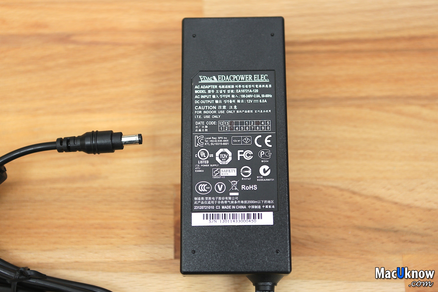 ▼電源供應器的背面,有許多的認證標示,可接受100~240V的電壓輸入,輸出是12V 6A。