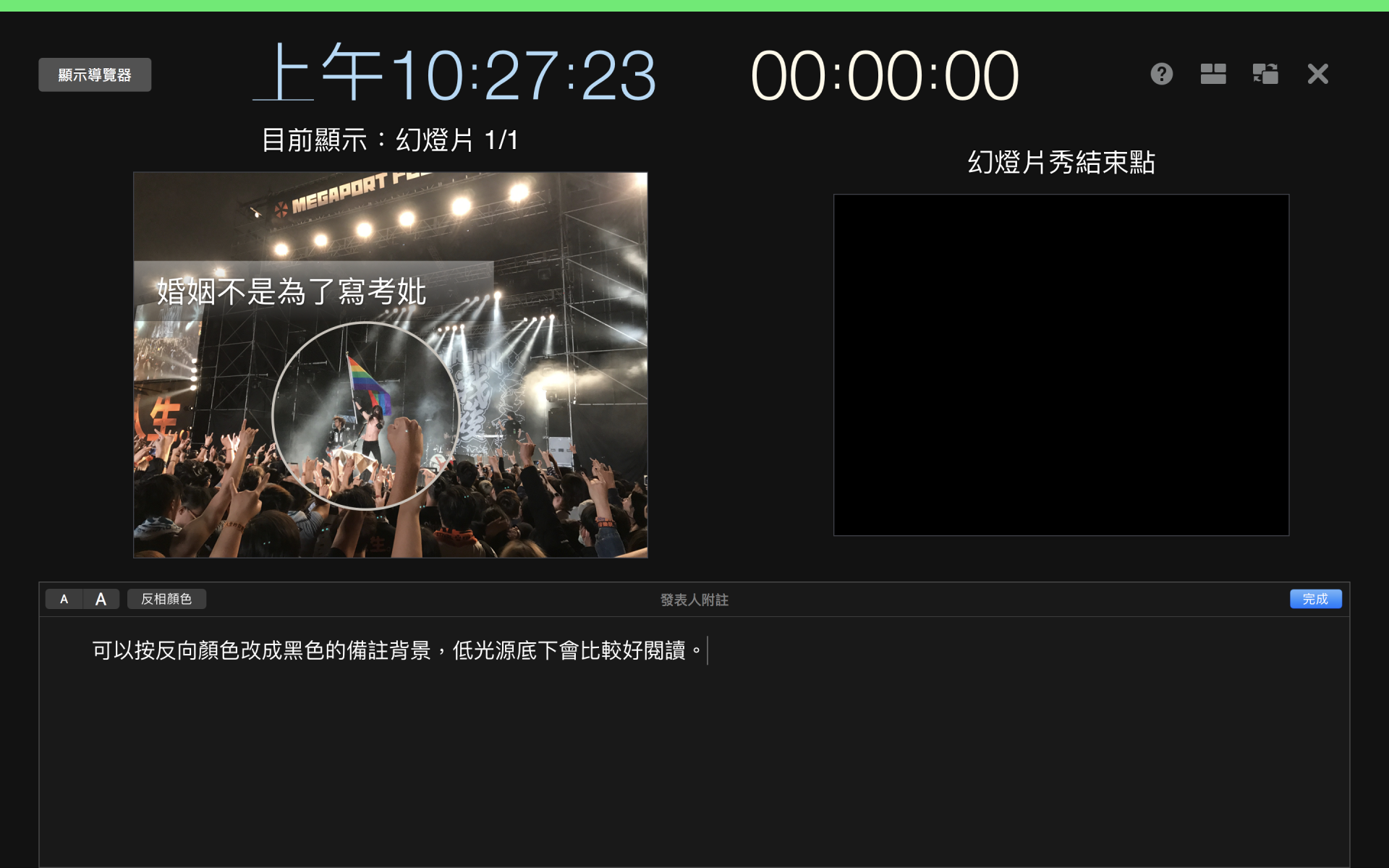 ▼ 而新的發表模式,可以讓原本是白底的備忘錄,變成黑底白字。這是很重要的一件事,因為大多演講的場地燈光都是比較昏暗的(要配合投影機),所以改成黑底白字,眼睛閱讀起來會輕鬆很多。
