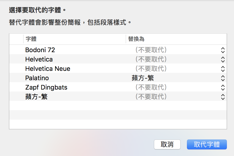 ▼ 打開之後,就可以把整份簡報中的某一種字體,通通改成另一種指定的字體。再也不需要一張一張檢查,然後一個一個改了。