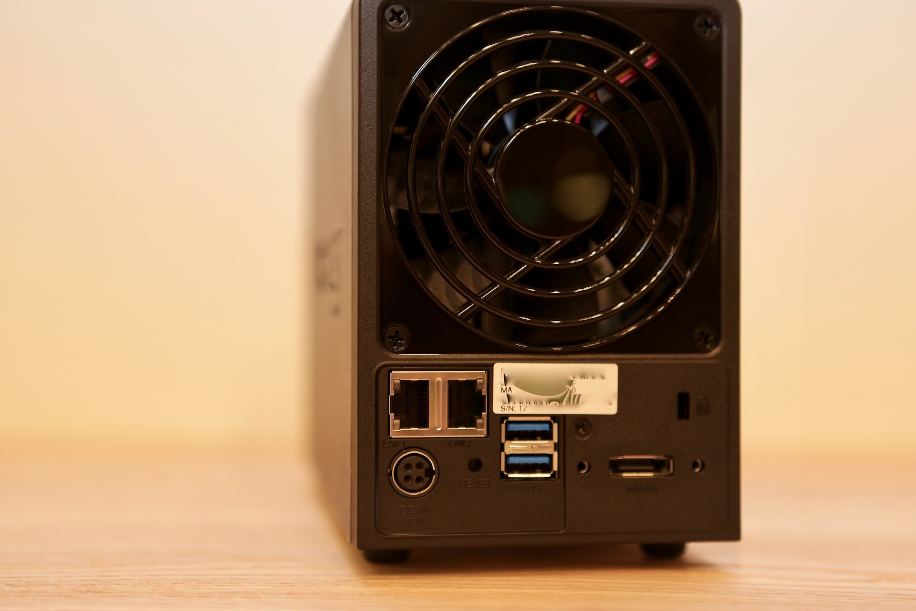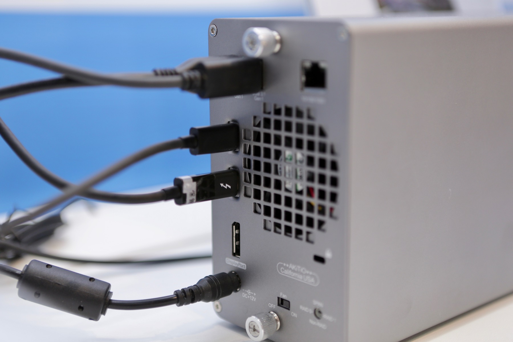 ▼ 除了正面可以插 SD 卡之外,兩顆硬碟可以做硬體 RAID,硬體 RAID 不是軟體 RAID 喔,1G 的網路孔,兩個 USB Type-A,DP 視訊輸出,然後再給你一個 ThunderBolt 3 串接,除了猛我真的沒別的好說。