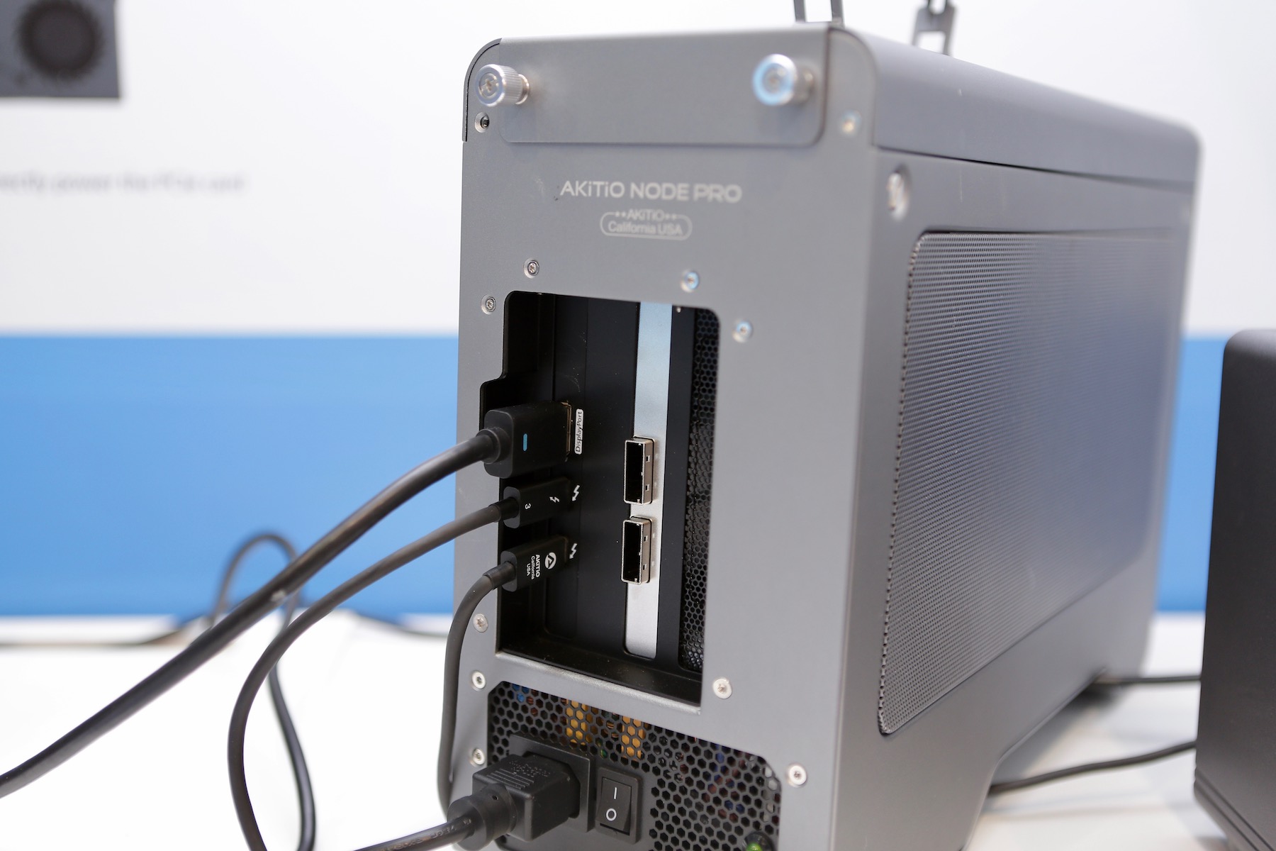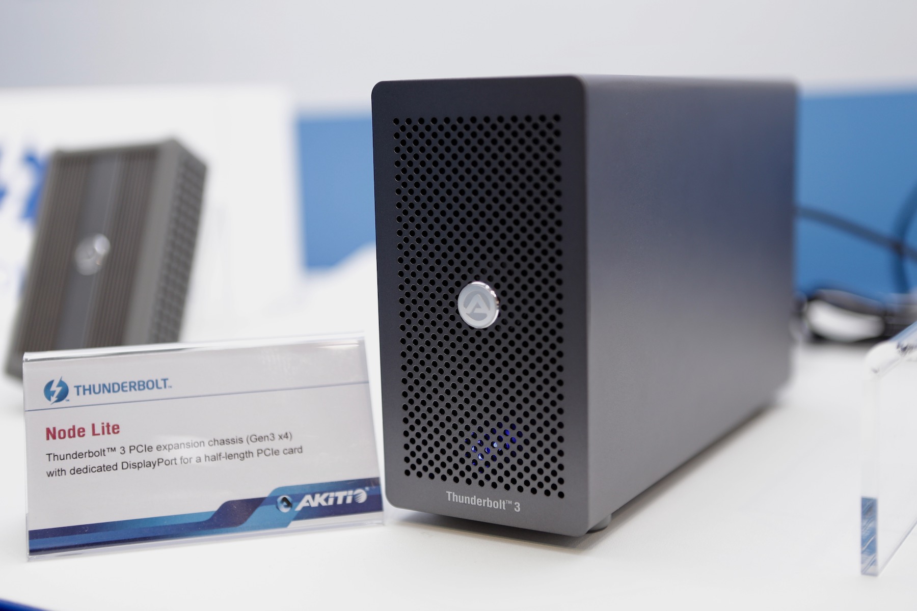 ▼ 現場展示了各種 ThunderBolt 3 的周邊,比如Thunder 3 Quad PD 四硬碟外接盒。不過我相信大家最期待的還是年底的 Node Pro。Node Pro 就是 Node 的改版,是一個 PCIE 卡的轉接盒,最大的用途就是拿來外接顯卡用。