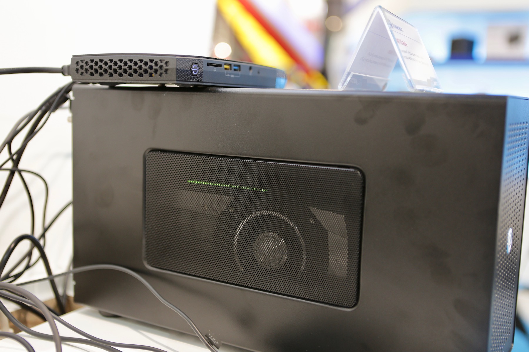 ▼ 比起 Node,這次 Node Pro 是太空灰的配色,最引人注目的點就是不用破解,可以直接外接顯卡!不過很可惜,他們說不能太高調,因為 Intel 還是不喜歡外接顯卡這個主意,所以盒子裡面是沒有放東西的。